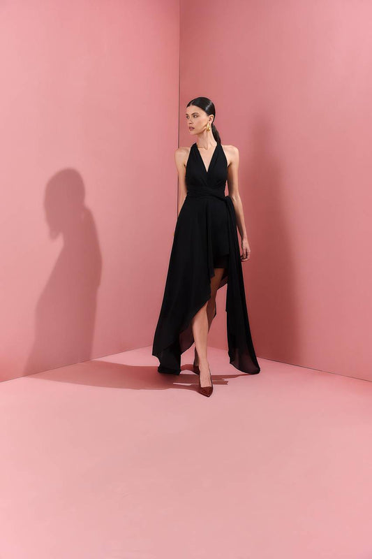 Vestido Assimétrico Maxi Amarração No Pescoço - Preto VES0059PTO