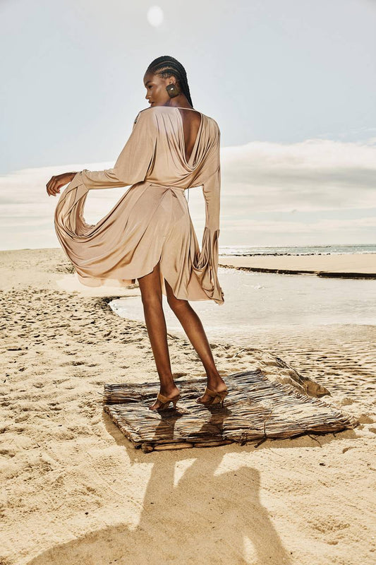 Vestido Manga Farta Crepe C/ Transparência - Bege VES0034BEG