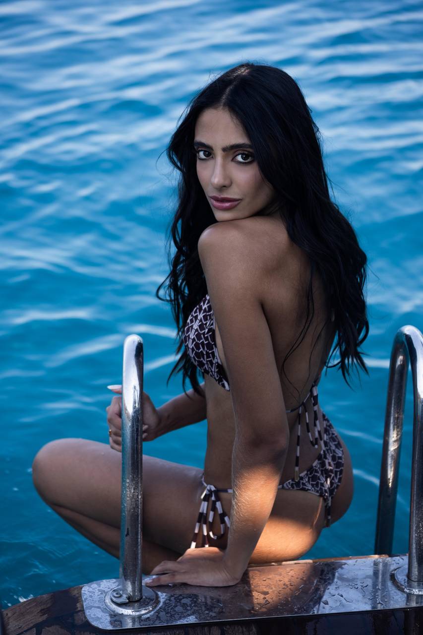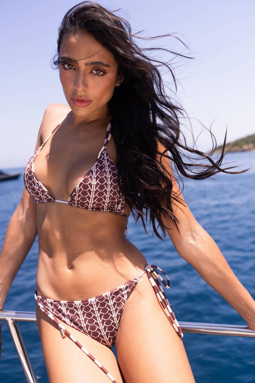 Biquíni estilo cortininha com estampa em tons terrosos, formando um padrão orgânico elegante e moderno. O sutiã apresenta alças finas com amarração no pescoço e nas costas, proporcionando ajuste personalizado. A parte debaixo segue o mesmo padrão, com modelagem cortininha e amarração lateral, criando um conjunto harmonioso e versátil para os dias de verão. A produção é complementada com acessórios dourados e uma saída de praia fluida, elevando o look com sofisticação.
