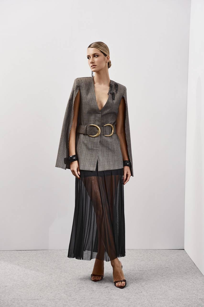 Blazer capa, de alfaiataria, confeccionado em tecido encorpado com padronagem sutil, trazendo estrutura e sofisticação à peça. A modelagem reta com recortes laterais abertos cria movimento e um visual contemporâneo, enquanto o decote profundo adiciona elegância e atitude. Versátil e marcante, é ideal para sobreposições modernas, produções fashionistas ou composições refinadas do dia à noite.