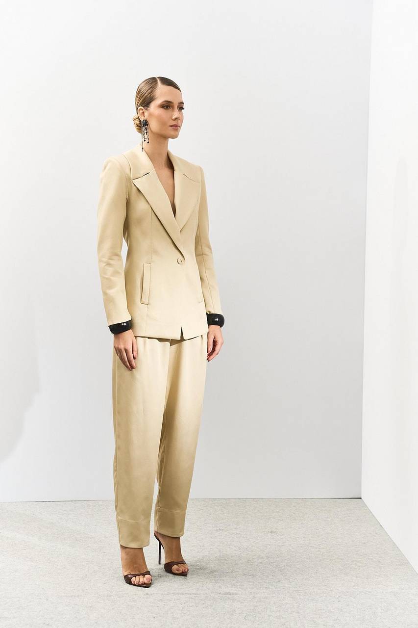 Blazer confeccionado em tecido encorpado com acabamento sofisticado, trazendo modelagem acinturada que valoriza a silhueta com elegância. A gola estruturada e o fechamento frontal por botão único reforçam a estética da alfaiataria contemporânea, enquanto o caimento preciso garante presença e sofisticação. Versátil e atemporal, é uma peça-chave para produções modernas, composições monocromáticas ou sobreposições refinadas do dia à noite.