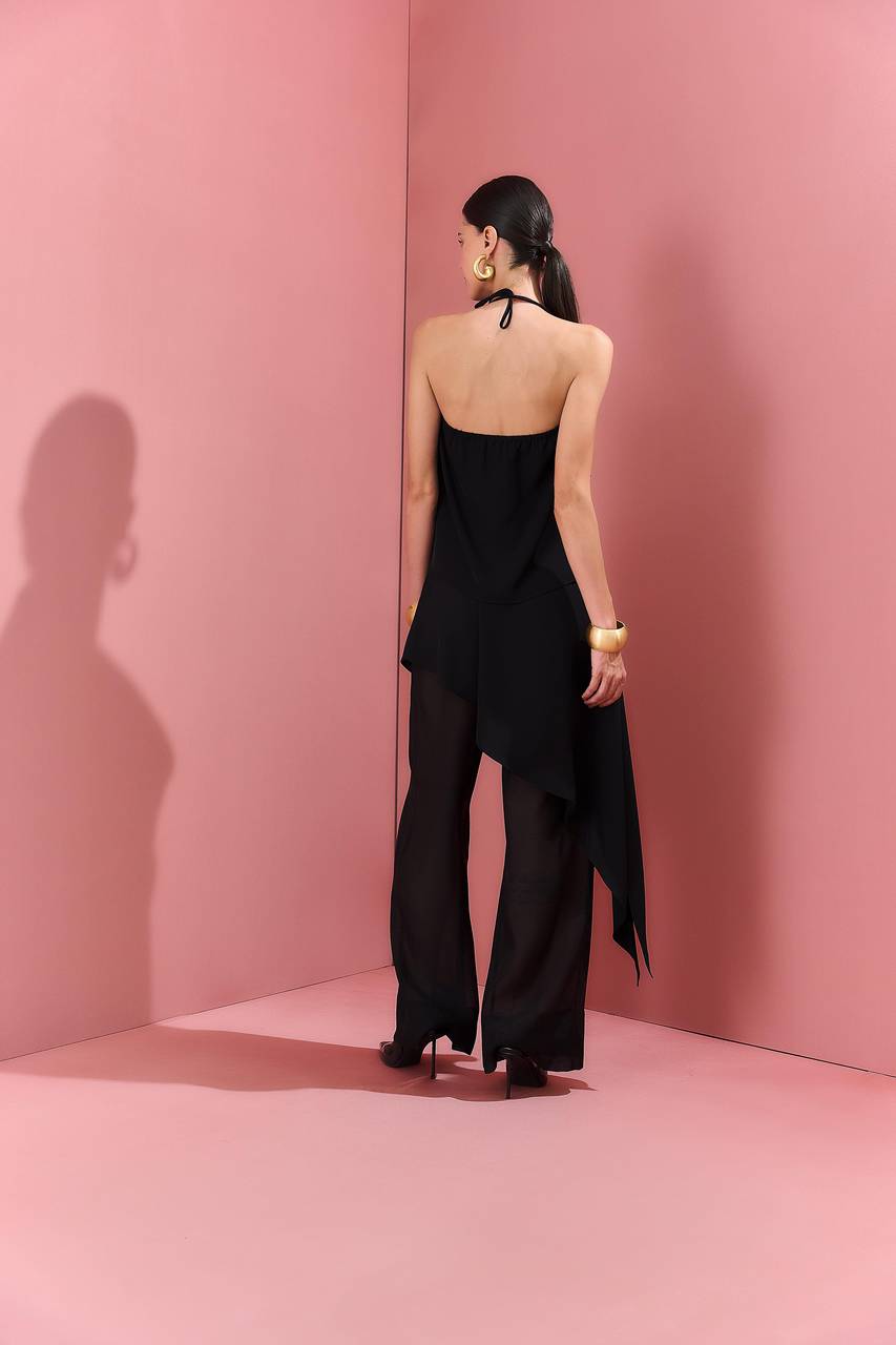 Elegante e moderna, esta blusa é confeccionada em tecido leve e fluido, garantindo movimento e sofisticação. O decote draped com amarração no pescoço adiciona feminilidade e valoriza a silhueta, enquanto a barra assimétrica cria um caimento diferenciado e contemporâneo. Uma peça versátil que transita entre produções casuais sofisticadas e ocasiões especiais.