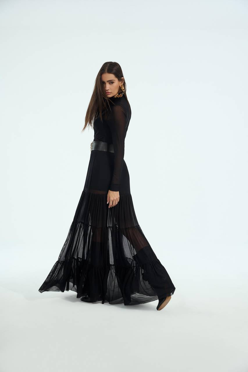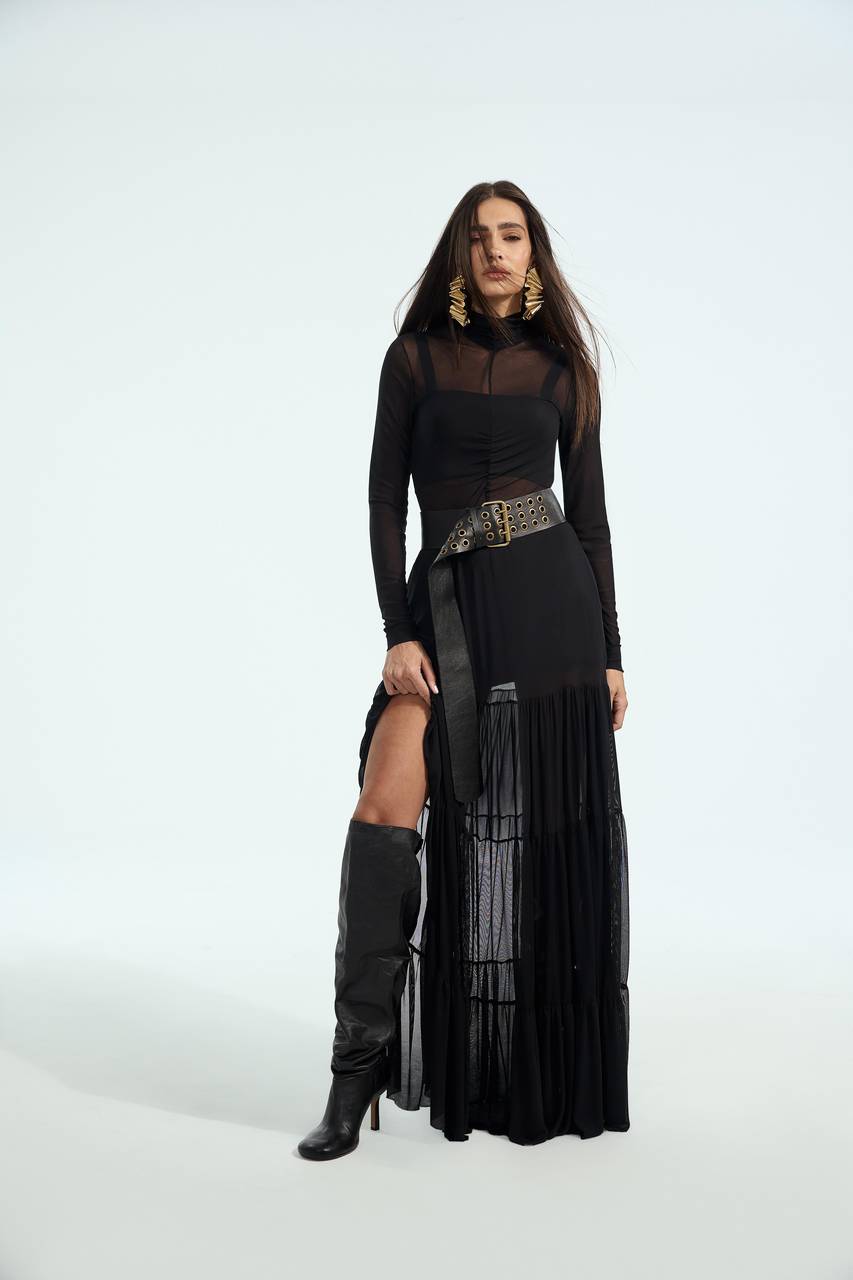 Blusa preta transparente de manga longa. Confeccionada em tecido leve e sutilmente translúcido, ela proporciona um visual elegante e sensual na medida certa. O modelo ajustado ao corpo destaca a silhueta, enquanto a gola alta adiciona um toque refinado.