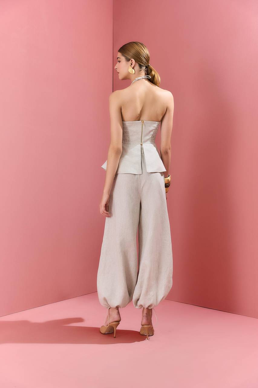 Confeccionado em linho com caimento leve e estrutura impecável, este top modelo halter traz recorte ajustado ao busto e detalhe peplum na barra, que valoriza a silhueta com sofisticação. O decote é finalizado por amarração delicada com ponteiras de pérolas, adicionando charme e feminilidade à peça. Ideal para composições elegantes nos dias quentes.