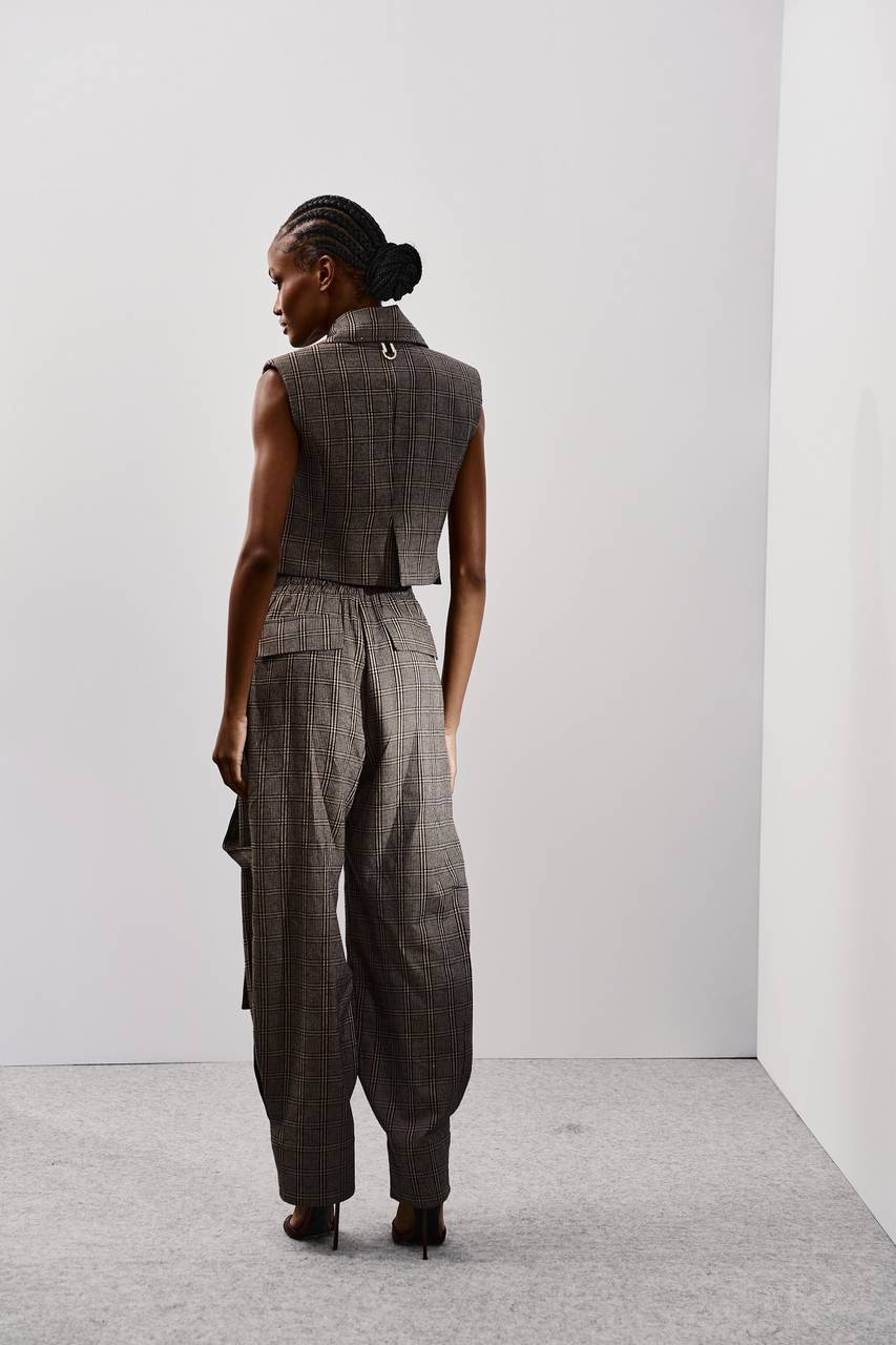 Calça de alfaiataria confeccionada em tecido encorpado com padronagem sutil, trazendo estrutura e sofisticação à peça. A modelagem ampla com recortes e bolsos utilitários cria um visual moderno e funcional, enquanto o caimento preciso valoriza a silhueta. Versátil e marcante, é ideal para produções urbanas elegantes ou composições fashionistas com identidade KOHDE.