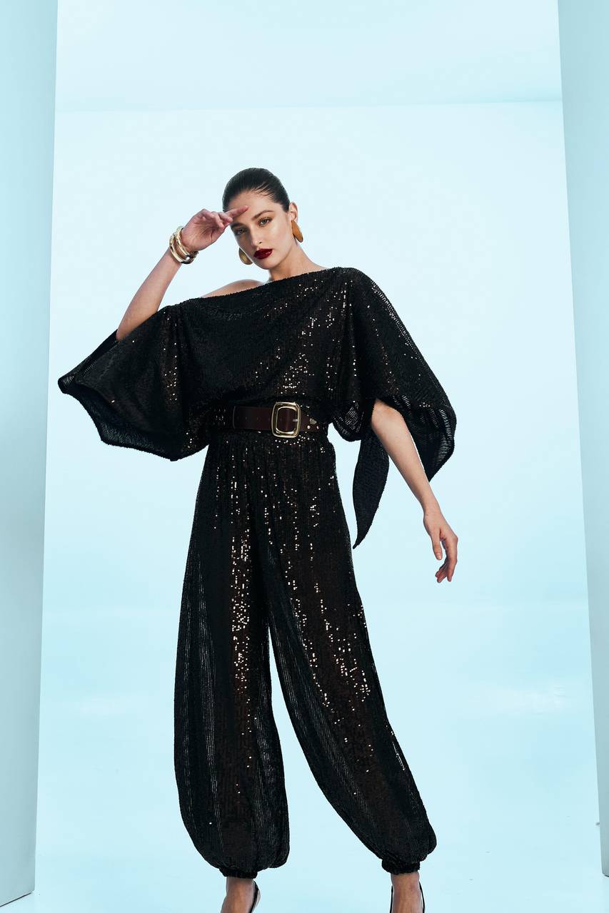 Calça em paetê marrom com caimento fluido e cintura alta, valorizando o movimento e o brilho de forma sutil e sofisticada. O modelo apresenta cós marcado e barra levemente afunilada, criando proporção elegante e moderna. Uma peça statement que traduz glamour contemporâneo — poderosa sem perder a leveza.