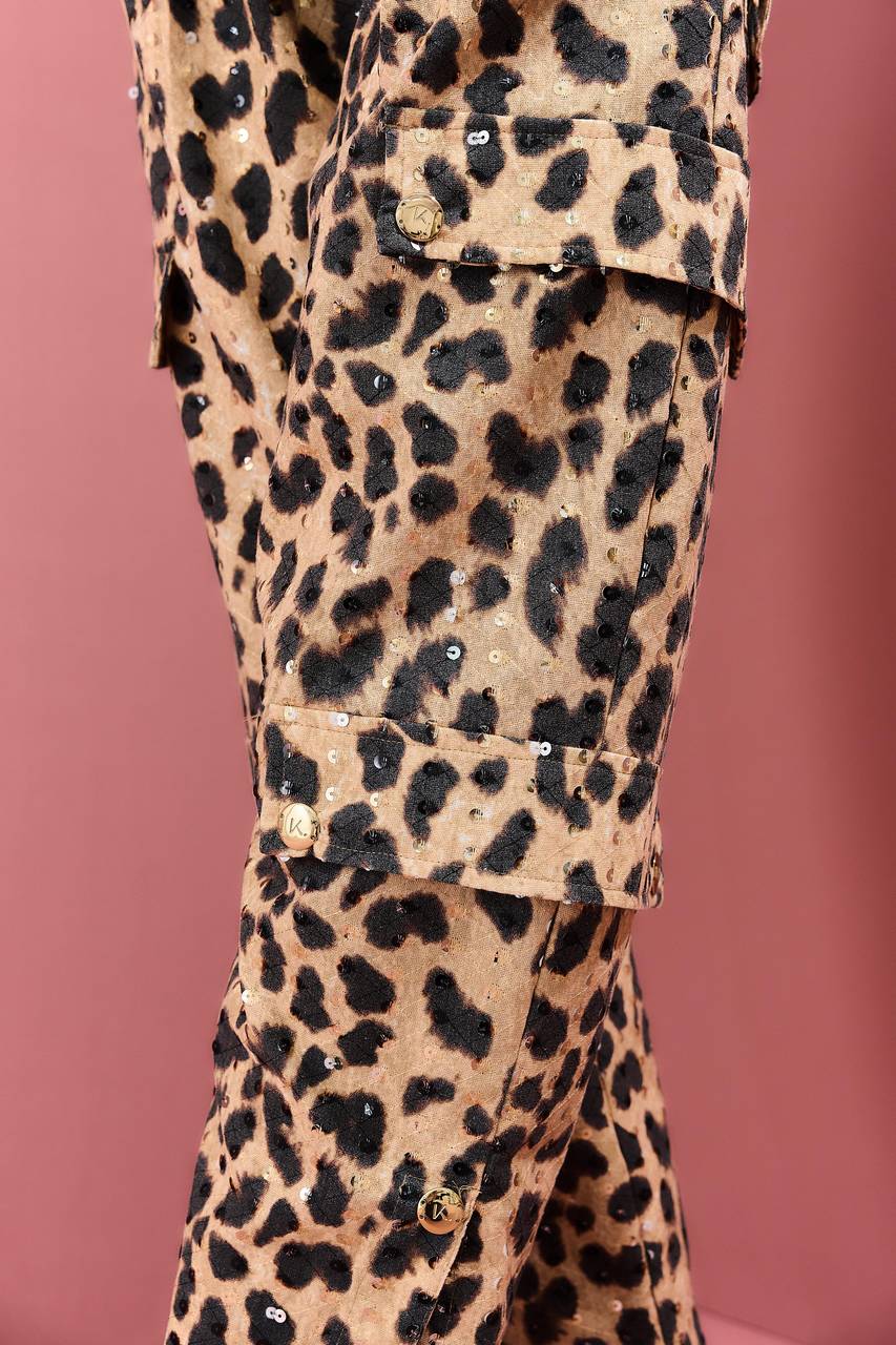 Com modelagem cargo moderna e cintura alta, esta calça se destaca pela estampa animal print em tom sofisticado e pela aplicação de botões dourados que trazem um toque de elegância. O shape levemente afunilado garante conforto sem perder a atitude, tornando a peça perfeita para produções urbanas e fashionistas.