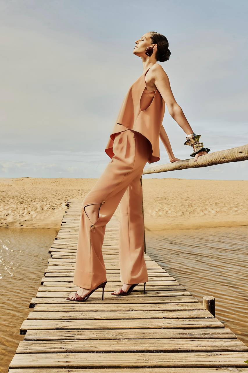 Calça ampla em tecido leve com abertura lateral arredondada e fechamento por botões, que revela sutilmente a pele com elegância. O recorte estratégico traz movimento e modernidade ao look, enquanto o cós estruturado garante conforto e sofisticação. Uma peça statement para mulheres que valorizam design autoral e caimento impecável.