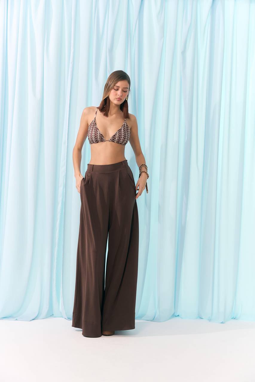 Calça pantalona com modelagem ampla e fluida. Feita em tecido leve e com caimento impecável, ela possui cintura alta com pala anatômica, pregas frontais sutis e bolsos laterais. Uma peça versátil e elegante, perfeita para composições que transitam entre o casual chic e o sofisticado de forma descomplicada.