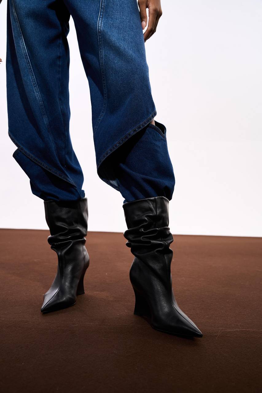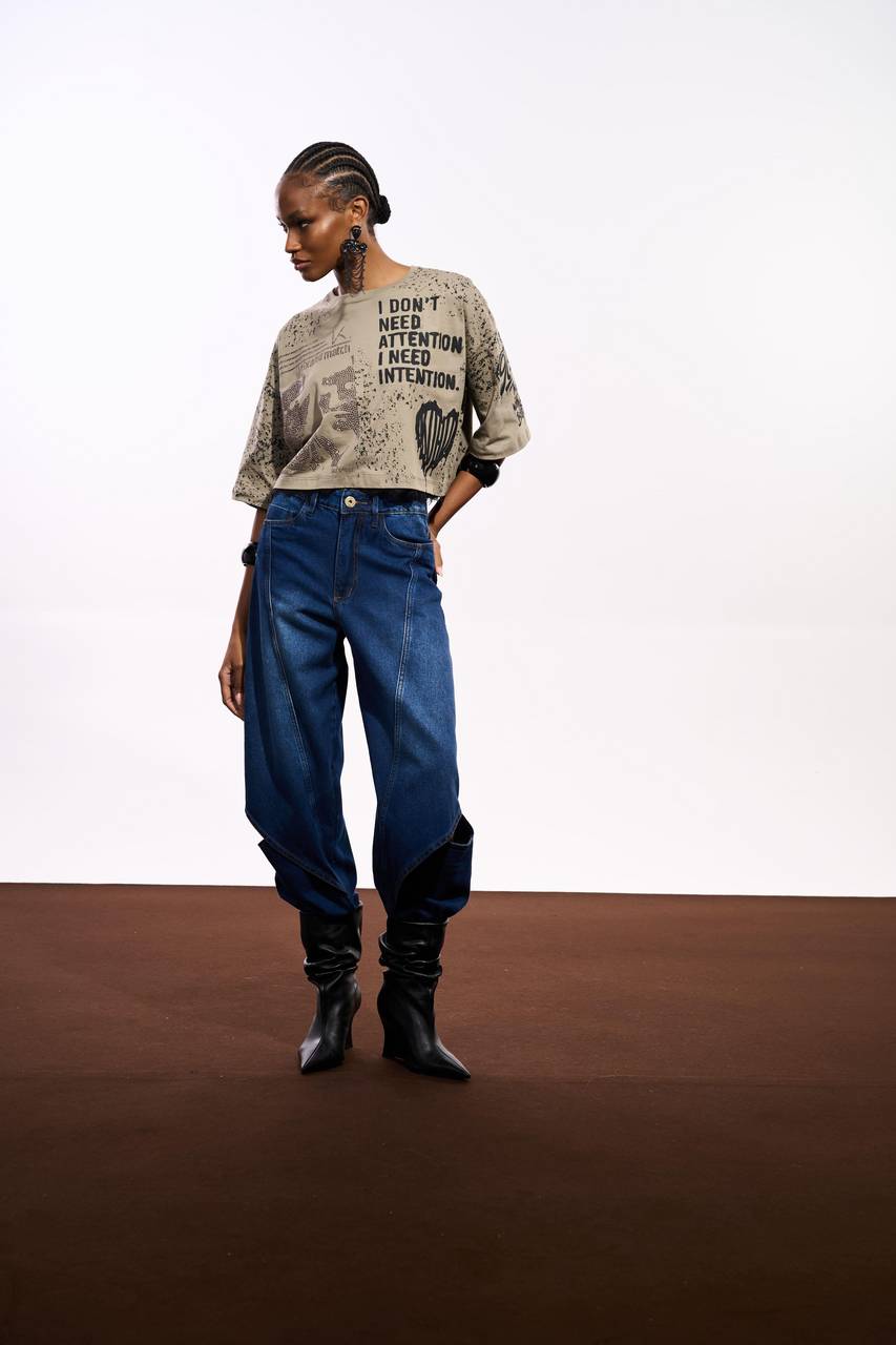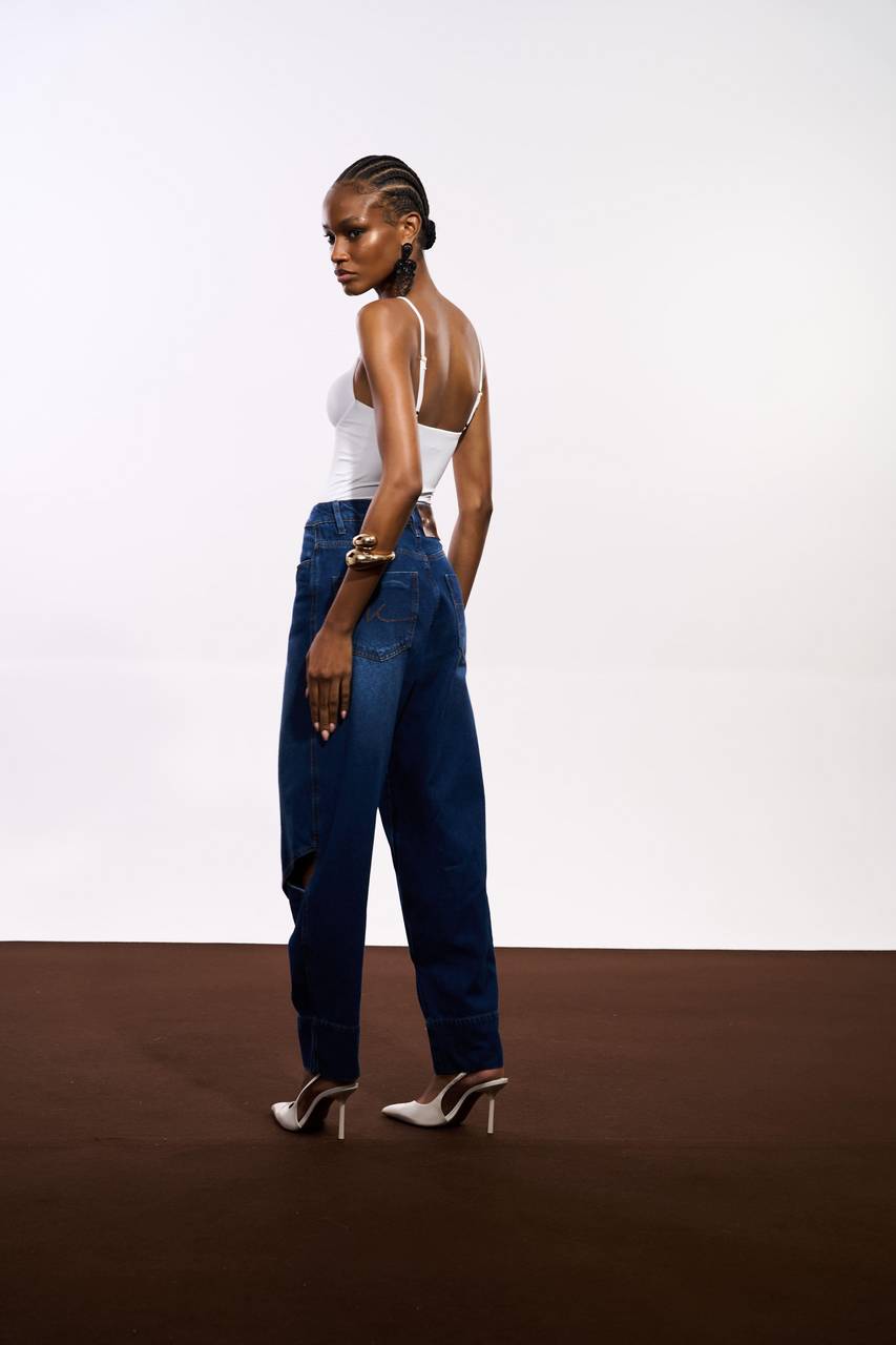 Calça jeans com modelagem contemporânea e construção marcada por recortes estratégicos que criam uma silhueta arquitetônica. O design combina volume no quadril com leve afunilamento nas pernas, proporcionando movimento e um caimento moderno. As costuras aparentes reforçam a estrutura da peça e destacam o trabalho de modelagem. Uma interpretação atual do jeans que explora proporção, design e atitude.