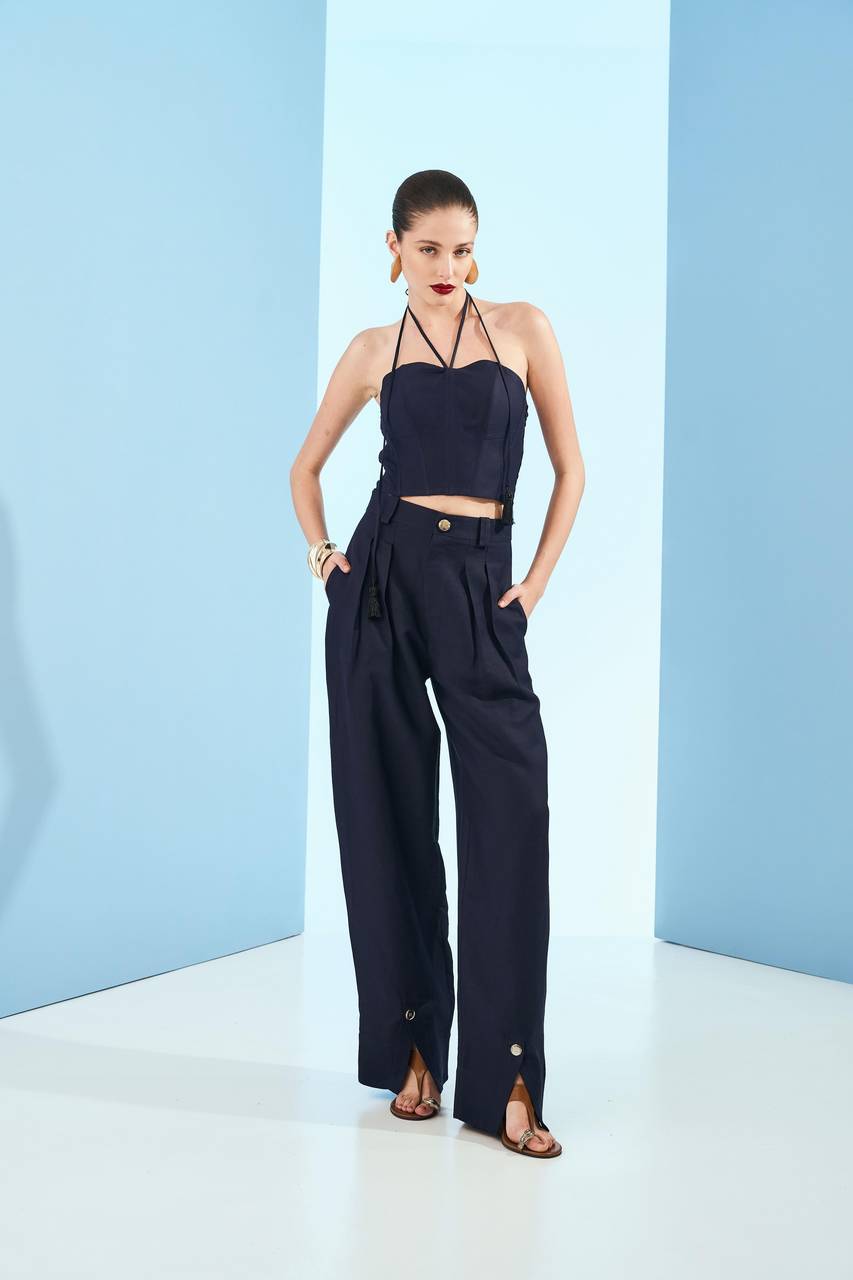 Calça em alfaiataria leve, com modelagem ampla e cintura alta. As pregas frontais e o fechamento com botão metálico trazem um toque clássico reinterpretado de forma contemporânea. A barra com abotoamento adiciona um detalhe de estilo utilitário sutil, reforçando o caráter versátil e sofisticado da peça.