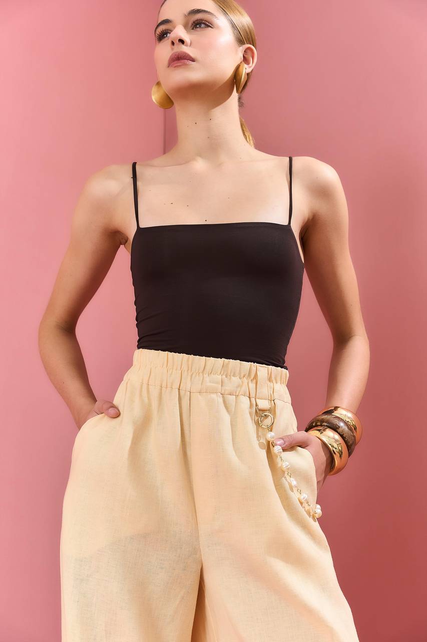 Sofisticada e leve, esta calça em linho natural possui shape solto com caimento fluido e cós alto. O detalhe da barra ajustável com amarração cria um efeito abalonado moderno, ideal para composições elegantes com frescor. Uma peça versátil e confortável para o dia a dia com sofisticação.