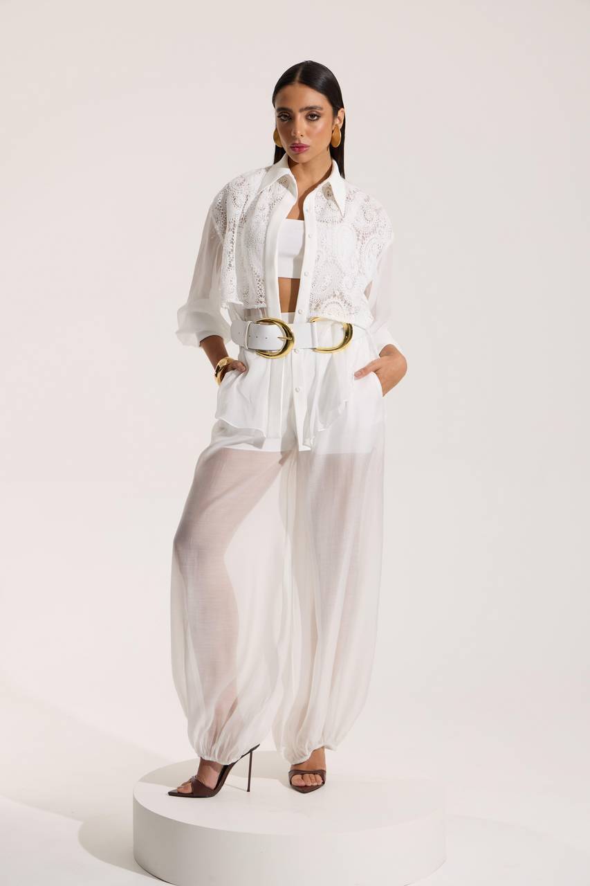 Camisa branca leve e sofisticada, com corpo em renda delicada e mangas em tecido translúcido, trazendo contraste de texturas de forma elegante. Possui modelagem ampla, fechamento frontal por botões e comprimento mais curto, que cria um visual moderno e versátil. Uma peça que combina frescor, feminilidade e estilo contemporâneo — perfeita para composições sofisticadas de verão.