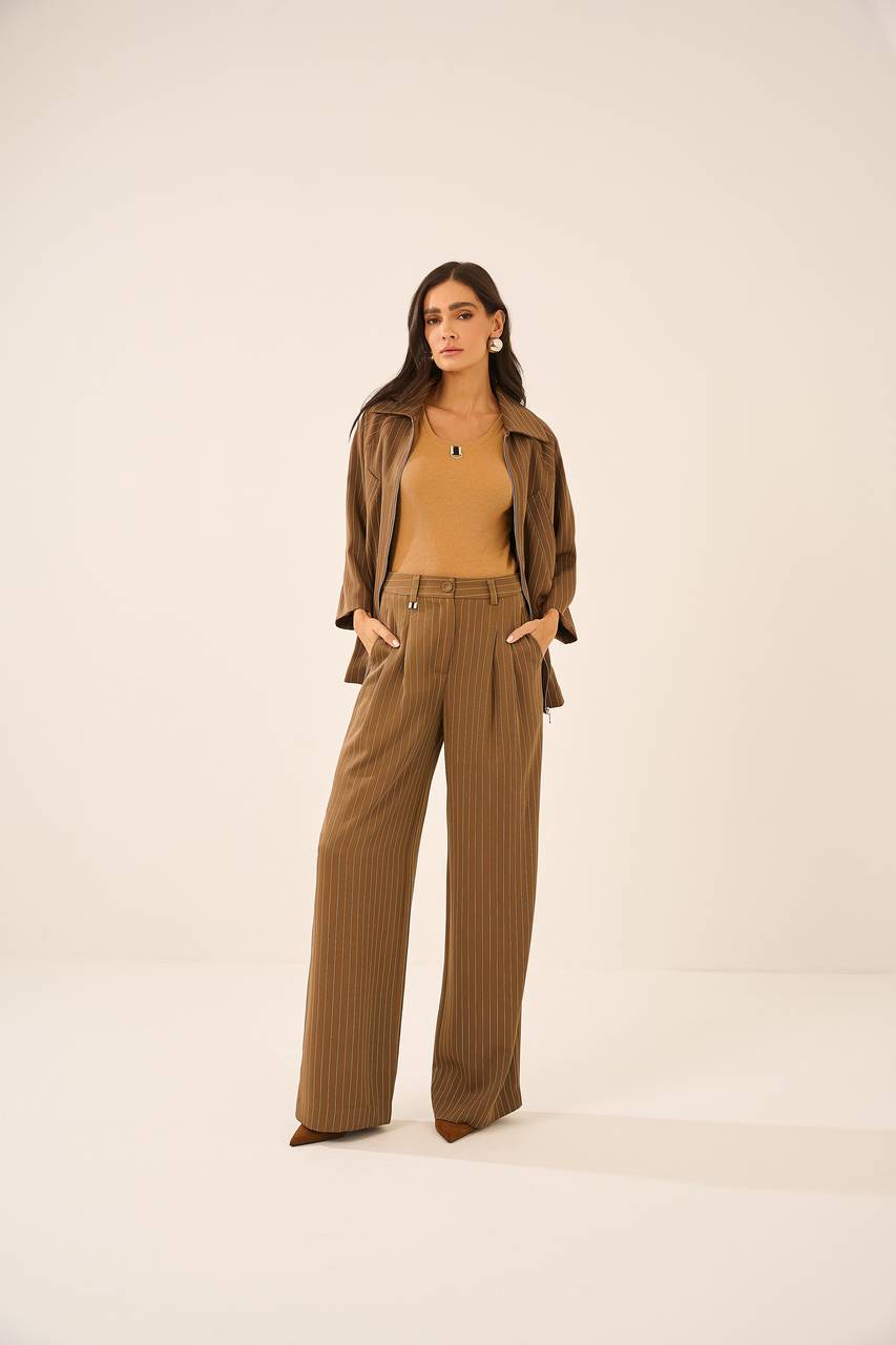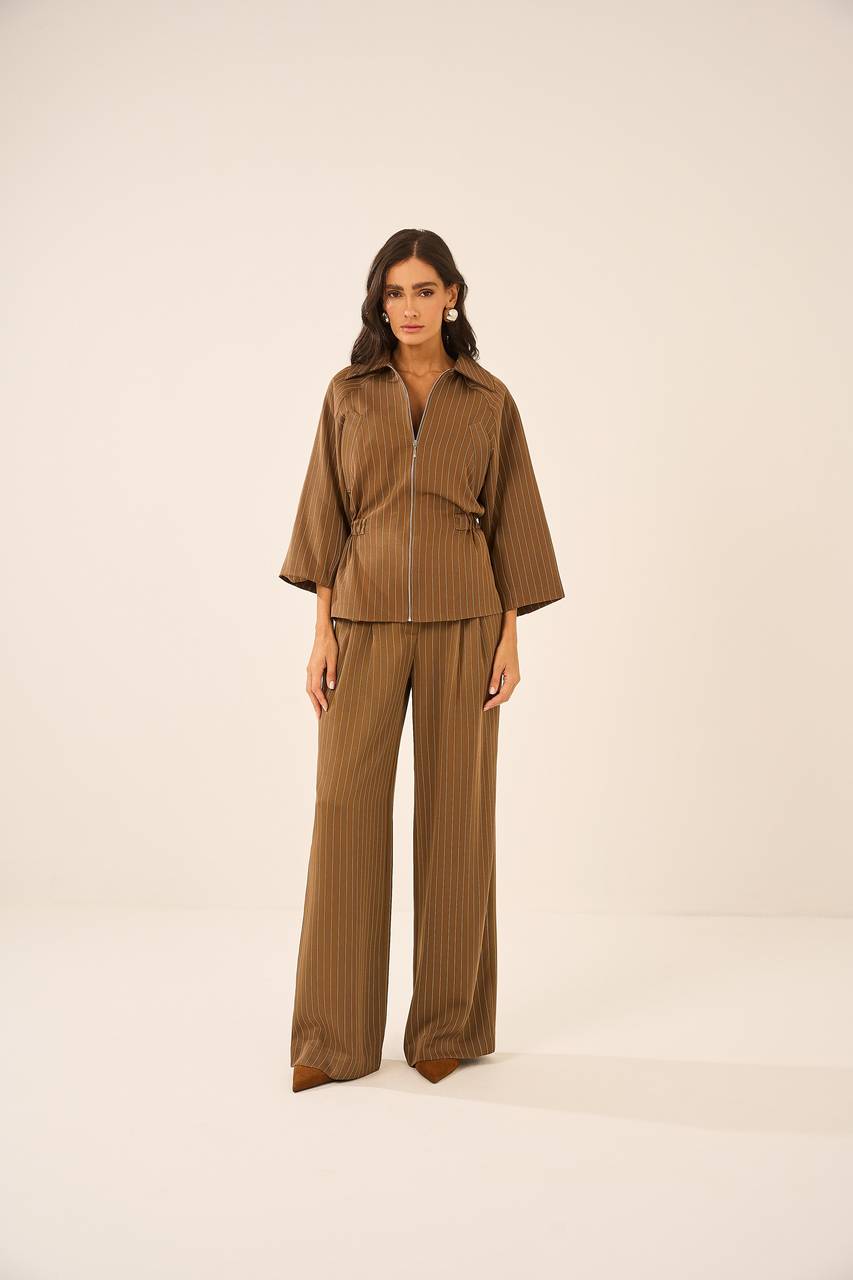 Elegância e modernidade definem este casaco de alfaiataria, com padronagem risca de giz. A peça apresenta modelagem levemente acinturada com ajuste por cordões laterais, criando um efeito sofisticado e estruturado. O fechamento frontal por zíper adiciona um toque contemporâneo, enquanto as mangas amplas garantem fluidez e sofisticação. Perfeito para composições refinadas, seja com peças de alfaiataria ou em combinações mais despojadas.