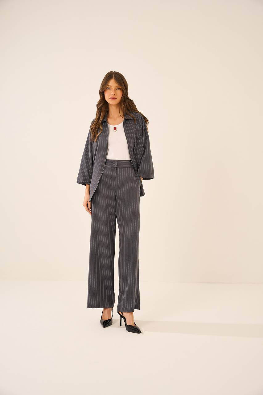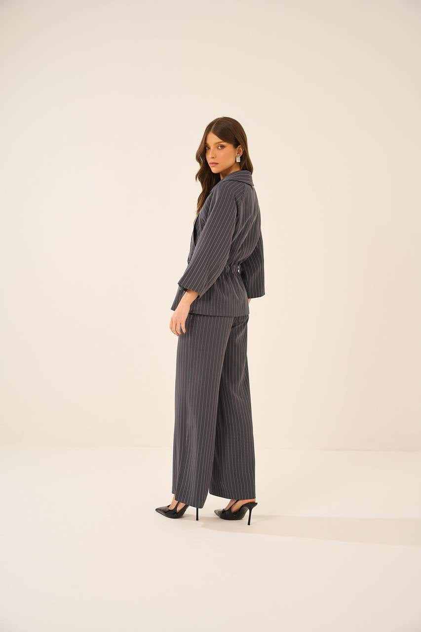 Elegância e modernidade definem este casaco de alfaiataria, com padronagem risca de giz. A peça apresenta modelagem levemente acinturada com ajuste por cordões laterais, criando um efeito sofisticado e estruturado. O fechamento frontal por zíper adiciona um toque contemporâneo, enquanto as mangas amplas garantem fluidez e sofisticação. Perfeito para composições refinadas, seja com peças de alfaiataria ou em combinações mais despojadas.