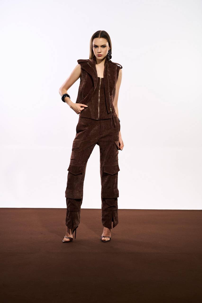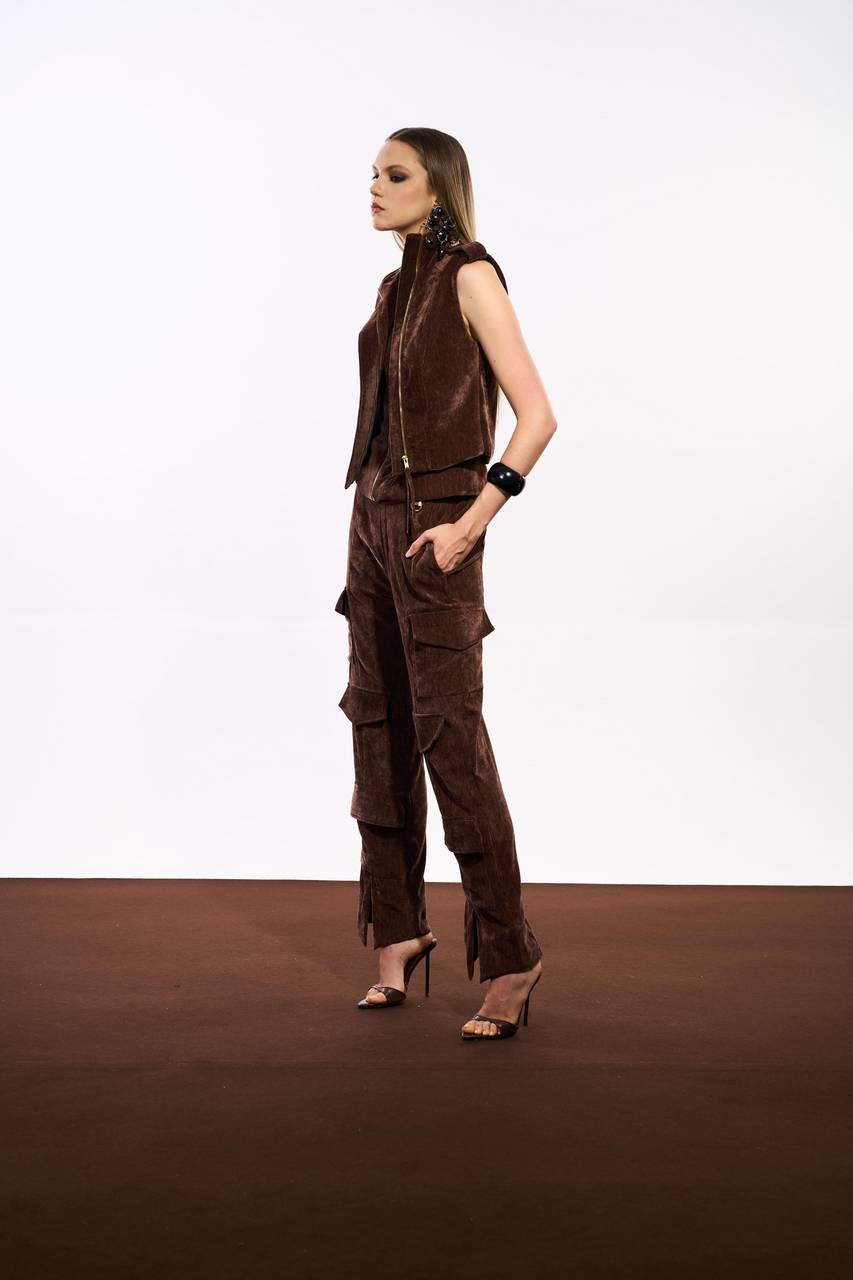 Colete confeccionado em tecido texturizado de toque macio, com modelagem estruturada que valoriza a silhueta e traz presença ao visual. O design sem mangas com gola ampla e fechamento frontal por zíper reforça a estética utilitária com acabamento sofisticado. Versátil e contemporâneo, é ideal para sobreposições modernas, produções urbanas ou composições fashionistas com identidade KOHDE.