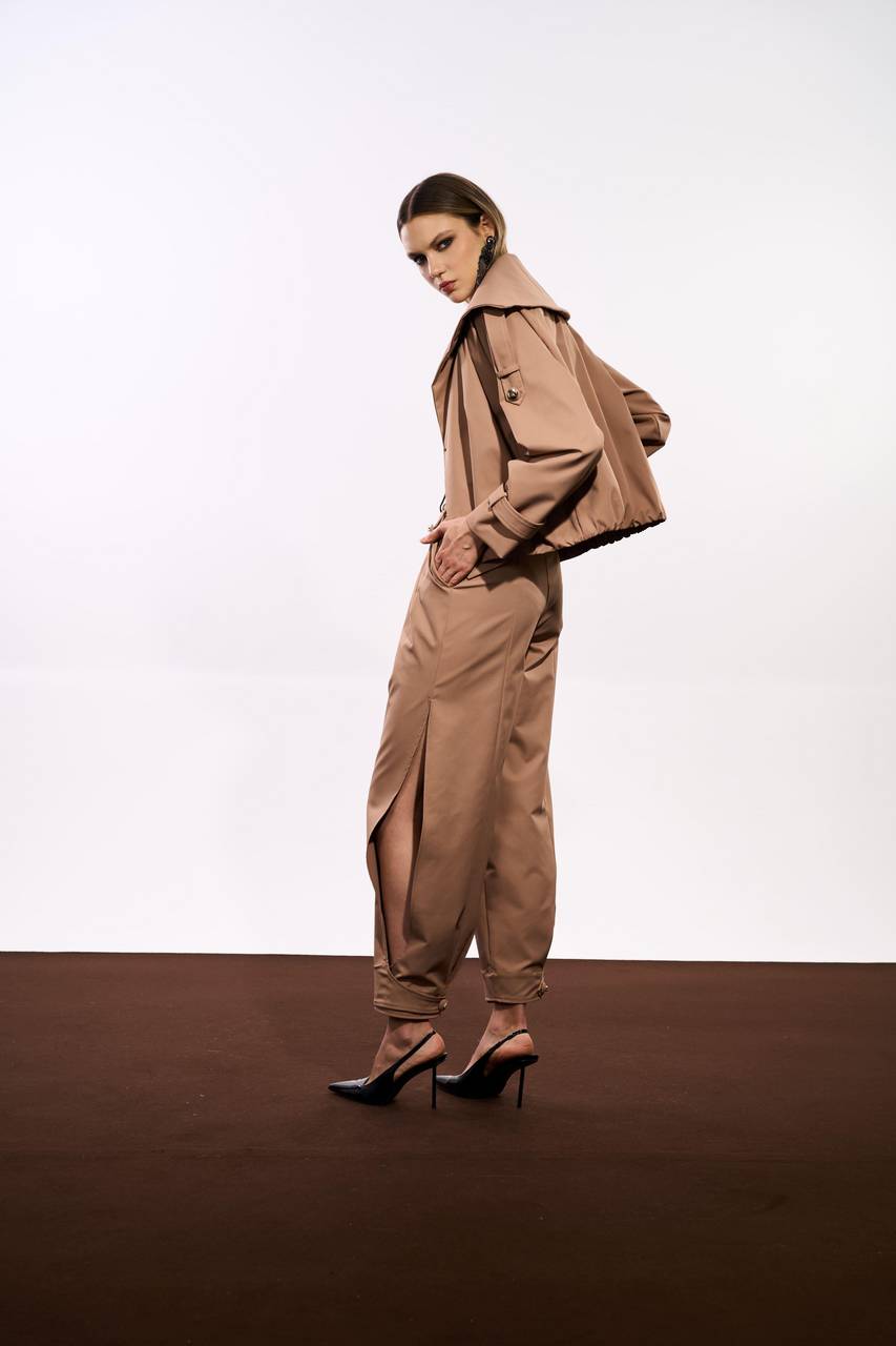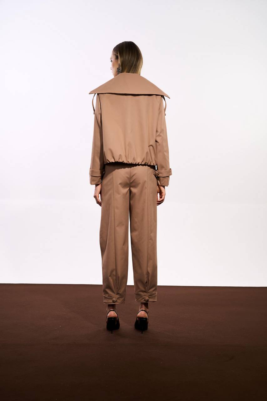 Jaqueta confeccionada em tecido encorpado de toque leve, com modelagem estruturada que traz presença e sofisticação ao visual. O design com gola ampla, abotoamento duplo e ajustes nos punhos reforça a estética utilitária com acabamento refinado. O comprimento levemente cropped adiciona modernidade à peça. Uma interpretação contemporânea do clássico trench.