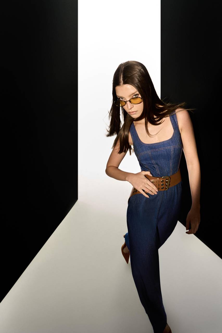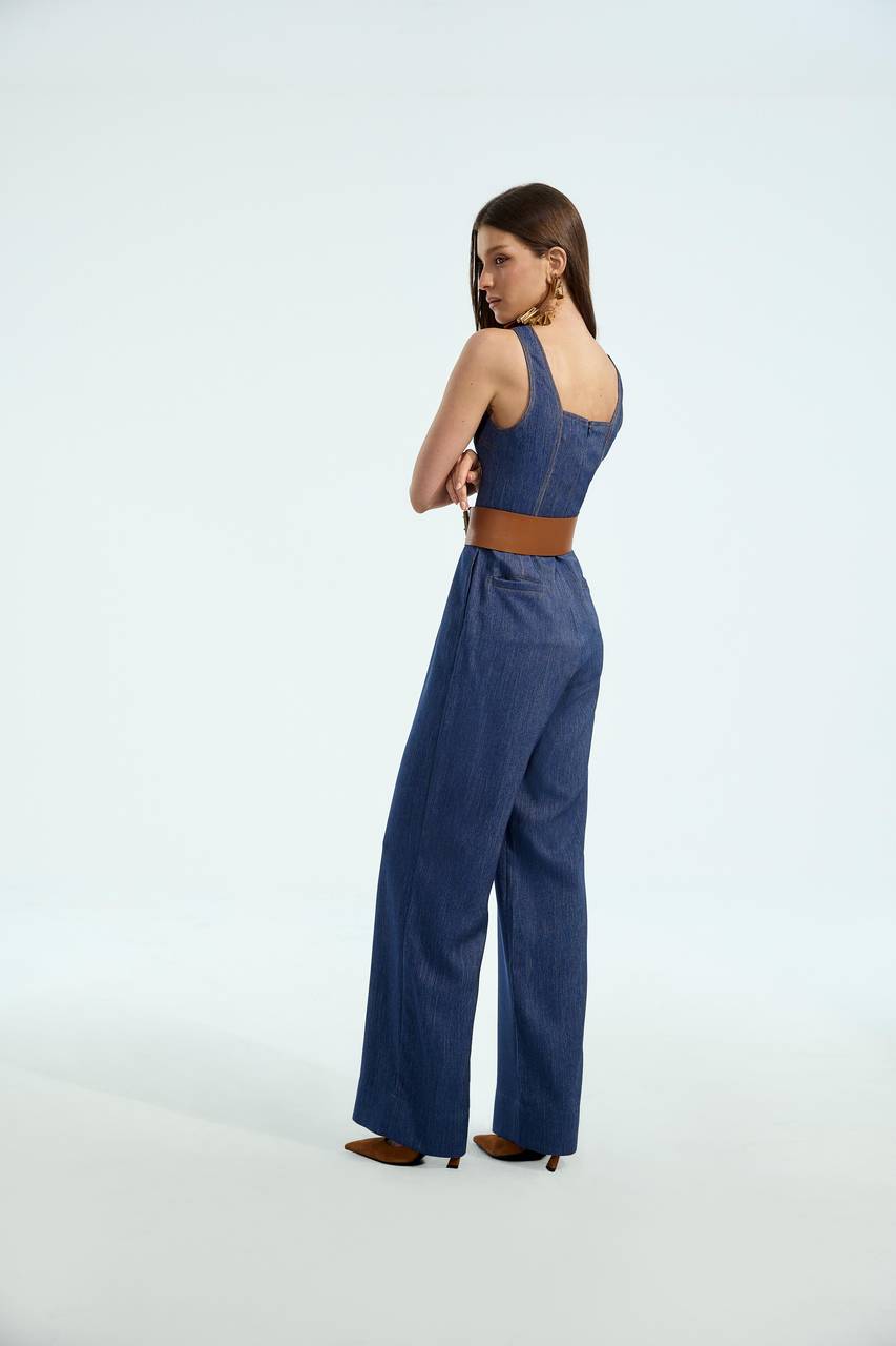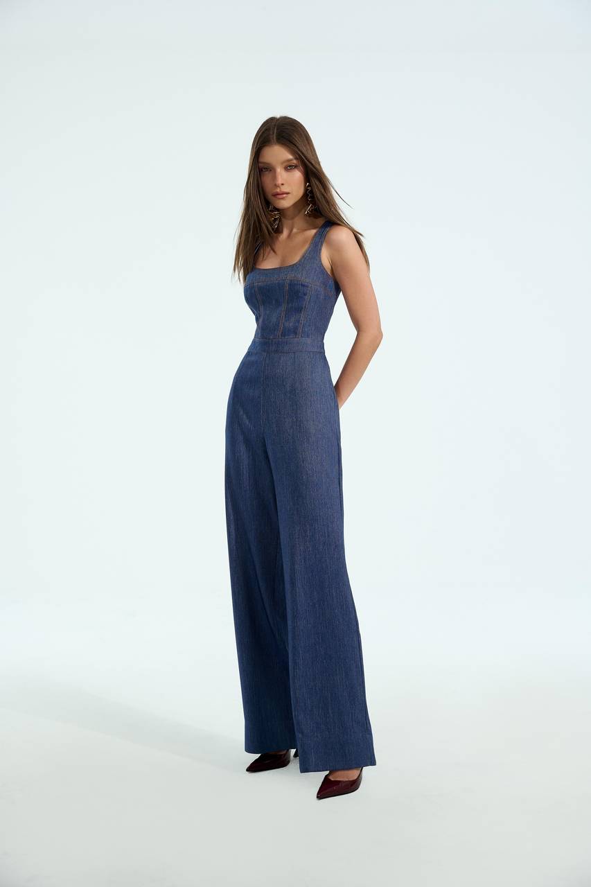 Macacão sofisticado em jeans estruturado, com modelagem ajustada ao corpo na parte superior e calça de caimento amplo. Apresenta decote reto com alças largas e recortes estratégicos que valorizam a silhueta. Ideal para um look moderno e elegante.