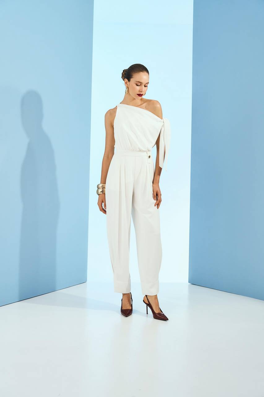 Macacãoem tecido leve de alfaiataria com toque acetinado. O modelo de um ombro só, com amarração lateral em laço, traduz elegância contemporânea e feminilidade sutil. A parte superior apresenta drapeado fluido que valoriza o colo, enquanto a calça de caimento reto com pregas frontais alonga a silhueta com sofisticação. O abotoamento lateral e o acabamento preciso reforçam o caráter premium da peça — uma escolha versátil e refinada, perfeita para ocasiões que pedem leveza e impacto.