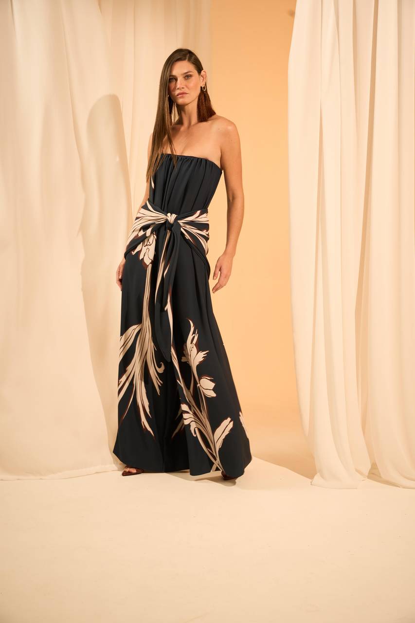 Macacão tomara que caia em tecido fluido com estampa floral em contraste, ideal para ocasiões que pedem elegância sem esforço. A peça possui caimento leve, decote reto com acabamento franzido e amarração frontal que valoriza a silhueta com sofisticação. A estampa exclusiva e a modelagem ampla conferem movimento e presença. Uma escolha refinada para mulheres que buscam estilo, conforto e impacto visual em uma única peça.