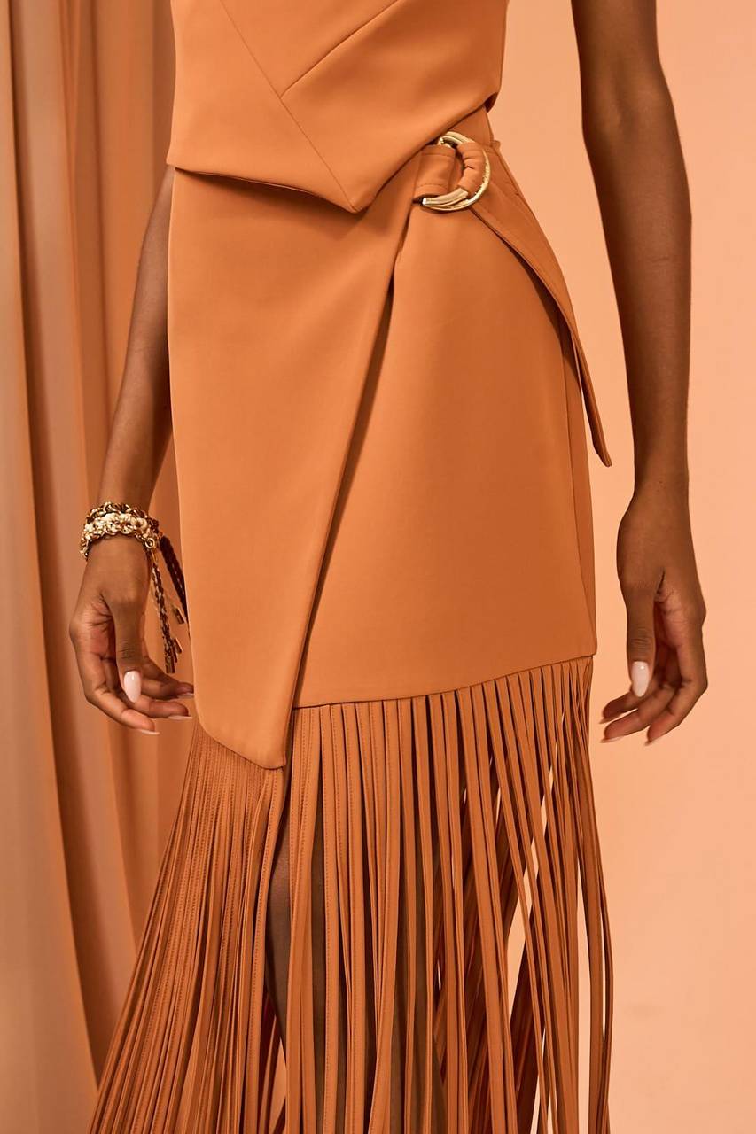 Saia midi assimétrica com design moderno e aplicação de franjas longas que trazem movimento e personalidade à peça. O recorte transpassado com detalhe de argola metálica cria uma silhueta elegante e marcante, enquanto o caimento estruturado valoriza a postura. Ideal para compor looks impactantes com toque fashionista, seja em produções noturnas ou em eventos especiais que pedem originalidade e sofisticação.