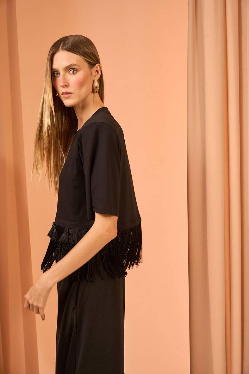 Blusa com modelagem reta e mangas curtas. O destaque fica por conta da aplicação de franjas longas na barra, que adicionam movimento e um toque moderno e ousado ao visual. Ideal para looks noturnos ou produções fashionistas com personalidade.