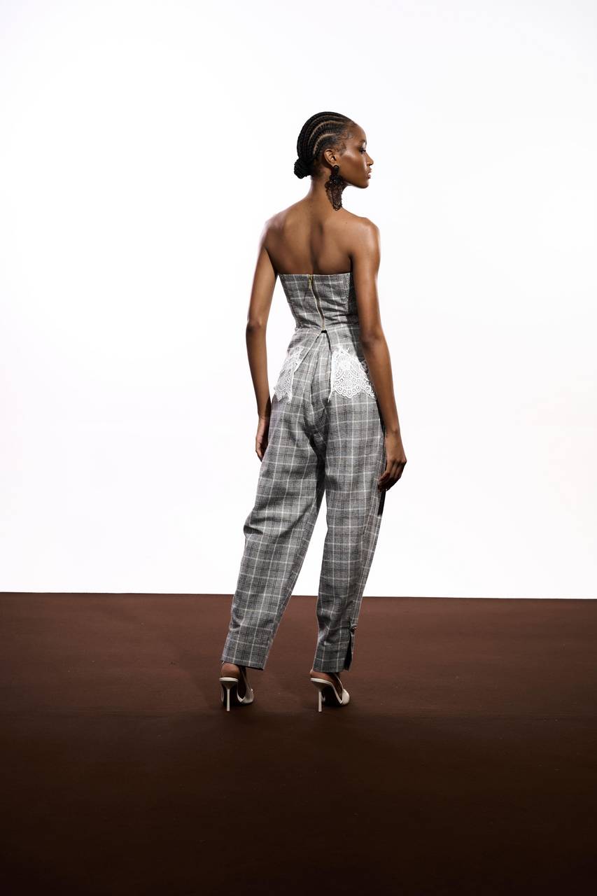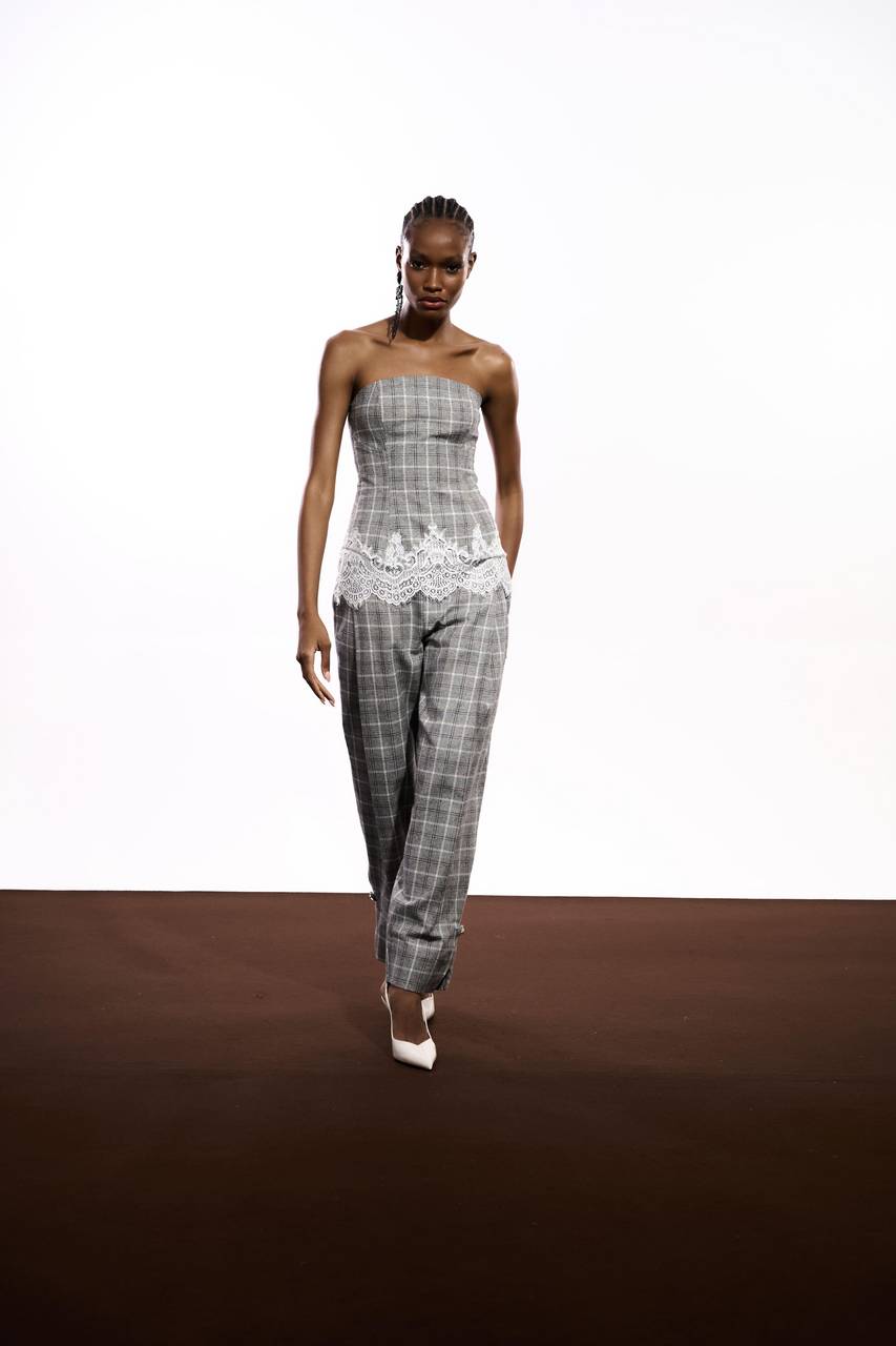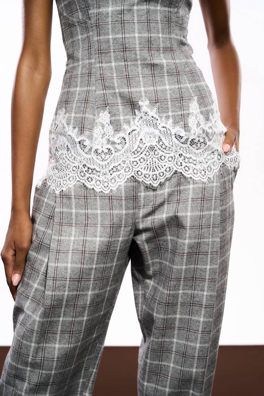 Top confeccionado em tecido encorpado com padronagem xadrez, trazendo estrutura e sofisticação à peça. A modelagem tomara que caia com busto estruturado valoriza a silhueta, enquanto o recorte inferior com acabamento em renda cria contraste delicado e adiciona feminilidade ao design. Uma peça que mistura alfaiataria e leveza com elegância contemporânea.